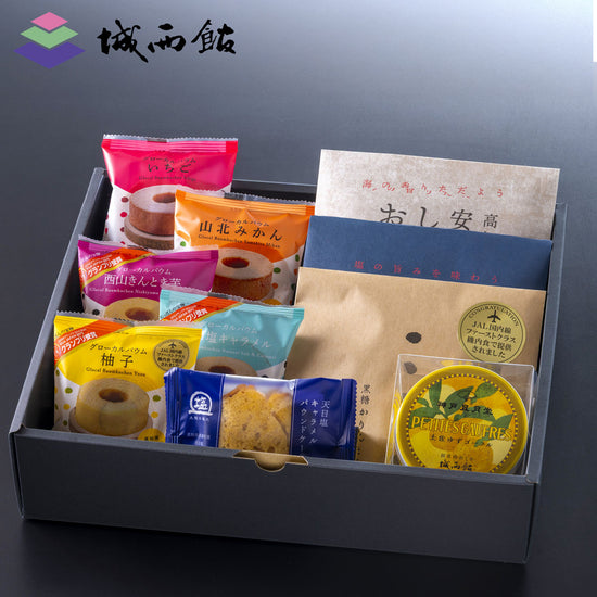 銀不老かりんとう54g×1、天日塩おかき54g×1、安芸市産おかき54g×1、天日塩キャラメルパウンドケーキ×1 グローカルバウム5個(柚子、天日塩キャラメル、西山きんとき芋、山北みかん、いちご/各1個)、土佐ゆずゴーフル×1缶 |