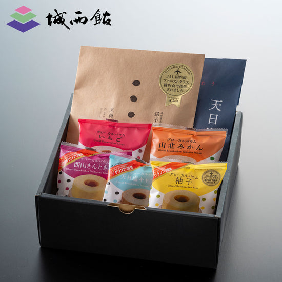 | 内容量 | 銀不老かりんとう54g×1、天日塩おかき54g×1、グローカルバウム5個(柚子、天日塩キャラメル、西山きんとき芋、山北みかん、いちご/各1個) |